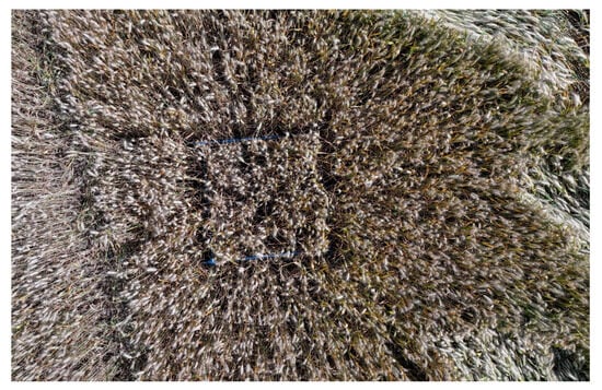 The collection of images started in the morning at 10:00, when temperatures were still low, as they rose above 29 °C during the day. For each lot, four to six sample points within the lot were chosen. When choosing the sample points, special consideration was made to ensure that they were adequately far apart and that the images captured all of the varying features within the field, including the density of the wheat, weed presence, and other factors. Afterwards, the drone operator captured images at the heights of 5 m, 10 m, and 20 m above ground level. Figure 2 shows a sample image taken at the height of 5 m, with an arrow pointing at the frame. This procedure was repeated for every sample point.