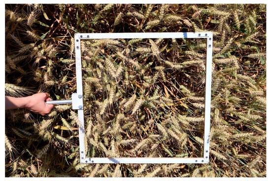 For images collected with a digital camera, a process similar to the one used for drone-based image collection was followed, with four to six sample points selected per plot. However, a different PVC frame measuring 0.5 × 0.5 m was used. The frame was held at approximately the same height as the wheat heads by an assistant, while the camera operator captured images. Figure 3 shows an image taken using this method. The camera was positioned directly above the frame with the lens parallel to the ground. This process was repeated for each sample point.
