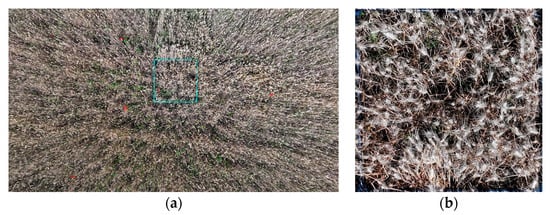 The original images taken by the aerial drone were recorded with a resolution of 5280 × 2970 px, 96 dpi, and 24-bit colour depth. For the purposes of AI training, it was necessary to extract the frames. As the frames had varying positions within the images, it was not feasible to automate this process, and it was conducted manually. In this process, the area of the image that contained the PVC frame, which was positioned on the ground and delimited the sample area, was cropped out. Figure 4a shows the original image with a blue frame representing the boundaries of the area being analyzed (the red dots visible in the image are flowers in the fields). Figure 4b shows an image with the frame extracted.