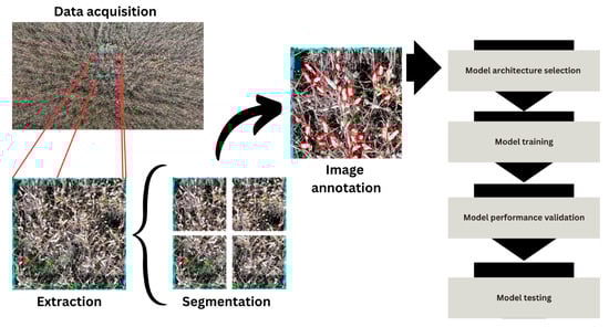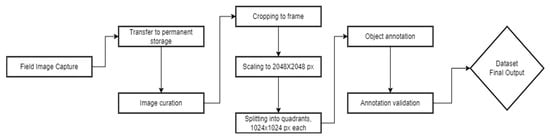 Following the extraction of the frames, the images were scaled to a size of 2048 × 2048 px. Then, the scaled images were split into four separate images, each containing one quadrant of the scaled image at a size of 1024 × 1024 px. This was performed to facilitate the next step of the process, which was the annotation. Namely, larger images made it easier to detect wheat heads. Detailed overview of the entire process from image capture to annotation is presented by the diagram shown in Figure 5.