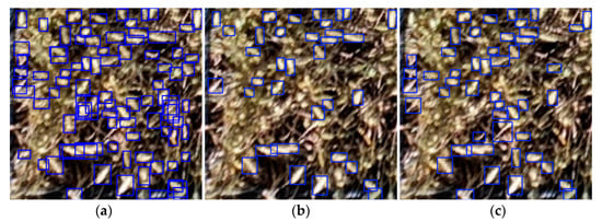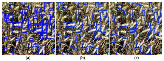 Figure 8 shows an example of one low-quality image from the dataset (blue boxes in the images are described in Section 2.3), where Faster R-CNN achieved an F1 score of 0.87 (Figure 8a). For the same image, YOLOv8 and RT-DETR achieved the same F1 score of 0.77 (Figure 8b,c). The frequent overlap indicates that the Faster R-CNN struggled with distinguishing individual wheat ears, especially in densely populated areas, leading to multiple bounding boxes around the same or nearby objects.