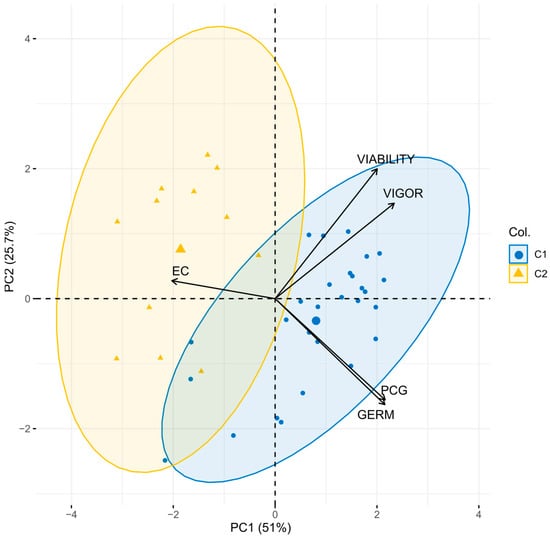 Principal component analysis for the variables PCG (first germination count), GERM (germination), EC (electrical conductivity), vigor, and viability to form two groups (C1—group with superior seed physiological quality and C2—group with inferior seed physiological quality) based on the K-means algorithm.