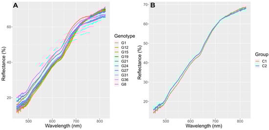 Evaluating the levels of seed reflectance among the genotypes (Figure 2A) and between the higher and lower physiological quality groups (Figure 2B) showed that physiological quality has an inverse relationship with reflectance up to the 700 nm range. Genotypes in the C1 group, i.e., genotypes with superior physiological quality, emit a lower level of reflectance than those in the C2 group, with inferior physiological quality.