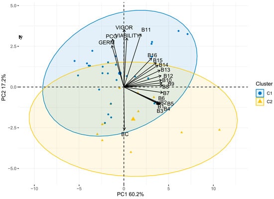 Principal component analysis for the variables PCG (first germination count), GERM (germination), EC (electrical conductivity), vigor, and viability, for bands B1 (450–475 nm), B2 (480 nm), B3 (481–500 nm), B4 (501–530 nm), B5 (531–539 nm), B6 (540 nm), B7 (541–649 nm), B8 (650 nm), B9 (661–670 nm), B10 (675 nm), B11 (676–684 nm), B12 (685–689 nm), B13 (690–700 nm), B14 (701–709 nm), B15 (710 nm), and B16 (711–730 nm) of 10 soybean genotypes to form two groups (C1—group with superior seed physiological quality and C2—group with inferior seed physiological quality) based on the K-means algorithm.