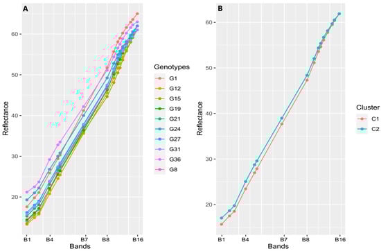 Genotype G36 was significant in all the spectral bands tested, except band B11 (Table 4). Genotype G1 was significant for almost all the spectral bands, except bands B4, B5, and B6.