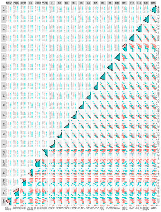 Scatterplot for the variables PCG (first germination count), GERM (germination), EC (electrical conductivity), vigor, and viability, and bands B1 (450–475 nm), B2 (480 nm), B3 (481–500 nm), B4 (501–530 nm), B5 (531–539 nm), B6 (540 nm), B7 (541–649 nm), B8 (650 nm), B9 (661–670 nm), B10 (675 nm), B11 (676–684 nm), B12 (685–689 nm), B13 (690–700 nm), B14 (701–709 nm), B15 (710 nm), and B16 (711–730 nm) of 10 soybean genotypes. *, ** and ***: significant at 5, 1 and 0.01% respectively.