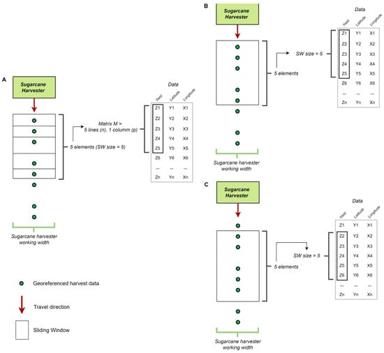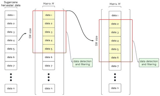 Each data point acquired (n) is composed of multiple features (p), stored into different columns. Thus, data acquisition results in a matrix (M) of dimensions n × p. The SW algorithm will later perform selecting one feature at a time (univariate SW) with selected SW size. Each data point inside the SW is also called an element. Therefore, if the size of the SW is equal to five (five elements), for example, this corresponds to the record of five sugarcane harvesting points obtained in the field and stored in the file, as shown in the scheme for obtaining SW (Figure 1).