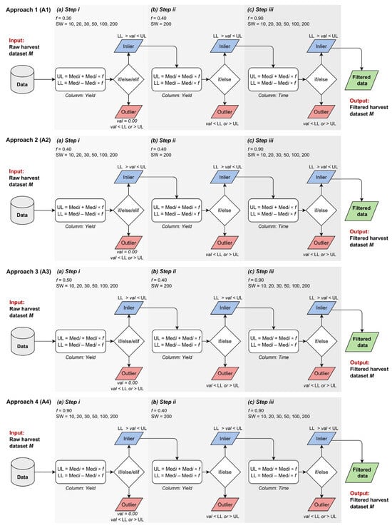 (a) Step i (input: Raw harvest dataset M, output: Filtered yield column from M, forwarded to step ii): Automatically, by defining the factor f (0.30, 0.40, 0.50, or 0.90) and the size of the SW (10, 20, 30, 50, 100, or 200), the “yield” column of the dataset is selected for filtering. UL and LL values are obtained and vary throughout the algorithm execution, due to the SW size, factor f, and dataset values within the SW. During the algorithm execution, the window slides over the data matrix and performs the filtering operation, checking the data one by one. Each time the window slides over the data matrix, a new UL and LL are obtained, and the filtering process is performed. Each value (n) is examined to verify whether it falls within the filtering interval. If it does, it is classified as an inlier and retained in the dataset (if); if the value is not within the UL and LL, it is considered an outlier and removed from the dataset (else). If the data are equal to zero (0), it is also considered an outlier and removed (elif). This operation is completed by iterating over the entire column of the data matrix. At the end of step i, a filtered dataset is obtained and automatically inserted into step ii.