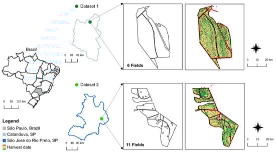 Two case studies were conducted in commercial sugarcane fields in the northwest region of the State of São Paulo, Brazil. The first dataset originates from sugarcane fields located in the municipality of Catanduva (21°8′18″ S, 48°58′26″ W; altitude: 532 m) (dataset 1—case study 1) and the second dataset is from sugarcane fields in São José do Rio Preto (20°49′13″ S, 49°22′47″ W; altitude: 510 m) (dataset 2—case study 2) (Figure 4). In case study 1, the dataset is composed of six areas, in a total of 48.99 ha, while case study 2 is composed of 11 sugarcane areas of 73.43 ha total (Table 1).