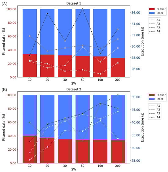 Averages of the filtered data (outliers and inliers) for the different sliding window sizes in the proposed approaches (y-axis on the left) and execution times of the proposed filtering algorithm (y-axis on the right) for dataset 1 (A) and 2 (B). SW: sliding window. A1, A2, A3, and A4: approaches 1, 2, 3, and 4.