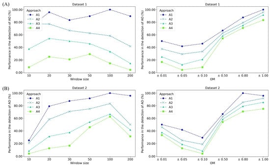 Dataset 2 exhibited a similar pattern to dataset 1. For OM values ≥±0.80, almost all AOs were detected, regardless of the SW size, with detection rates of 98.00 to 100.00%. For OM = ±0.50, inferior performance was observed in approaches A3 and A4, while approaches A1 and A2 stood out as having the best performance.