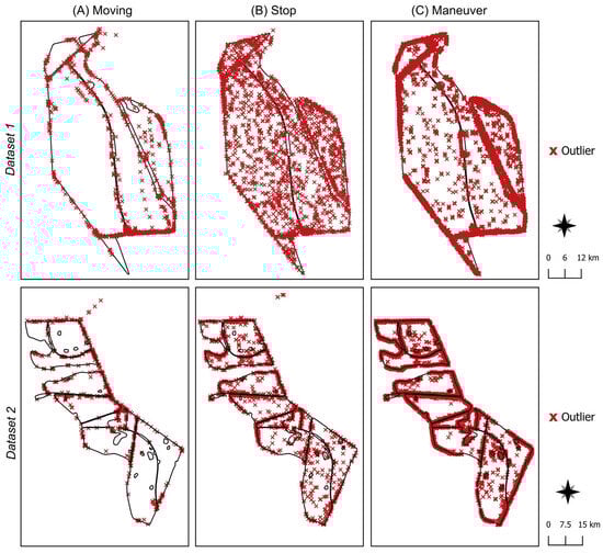 The detection of outliers by the sliding window method proposed for the sugarcane harvesting data corresponding to the operations of displacement (A), stop (B), and maneuver (C) of the harvester in the field in datasets 1 and 2.