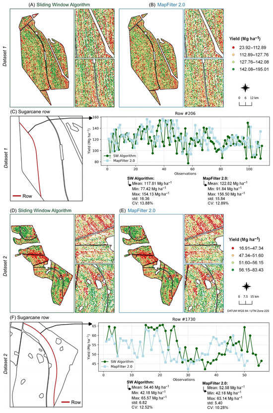 In dataset 1, the yield values ranged from 0.00 to 860.16 Mg ha−1 in the raw data, from 23.92 to 195.01 Mg ha−1 in the data filtered by the proposed method, and from 85.54 to 158.82 Mg ha−1 in the data filtered by the comparative method. For dataset 2, the values were from 0.00 to 233.99 Mg ha−1 for the raw data, from 16.91 to 83.43 Mg ha−1 for the data filtered by the proposed method, and from 34.43 to 63.44 Mg ha−1 for MapFilter 2.0. It is evident that the proposed SW algorithm preserved a greater range of yield values and greater data variability in the sugarcane fields compared to MapFilter 2.0, as highlighted by the higher CV and SD values. This is relevant because sugarcane exhibits high biomass variability over short distances [], indicating that the SW algorithm was able to handle yield spatial variability in the field at the row level. Despite differences in some statistical parameters, the filtering methods were equivalent in identifying regions with different sugarcane yield potentials. Therefore, the proposed method allowed for the retention of data reflecting the existing yield variability in the sugarcane fields (Figure 8).