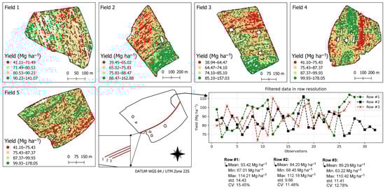 Yield maps filtered by the proposed method using the best configuration of the sliding window algorithm (A1, SW = 50, f = 0.30) for dataset 3. Three rows in field 5 are highlighted, illustrating the variability within and between them.