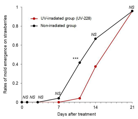 Effect of UV irradiation on mold emergence during strawberry storage. Given the same storage duration, the mold emergence rates were compared between the UV–irradiated and non–irradiated groups (NS: p > 0.05; ***: p < 0.01; Fisher’s test).