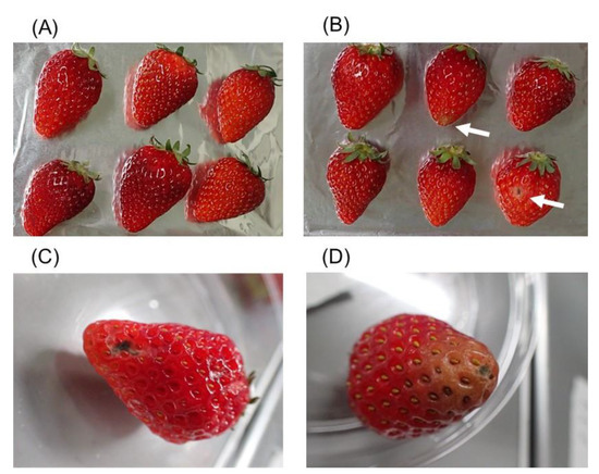 Photographs of strawberries after storage with UV–irradiated treatment (A) and non–irradiated one (B). Appearance of infected strawberries by mold after storage (C,D). All photographs were taken 7 days after storage at 5 °C, 70% RH, and strawberries in photographs excepted the data of mold emergence. White arrows show the points of mold appearance.
