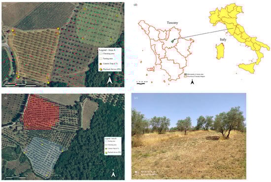 (a) Camera Traps (CTs) and Playback Devices (PDs) placed in testing and checking area A; (b) CTs and PDs placed in testing and checking area B; (c) Installation of a PD in the olive grove; (d) Geographical location of the study area.