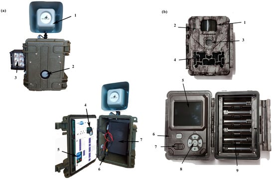 Playback device (a) components: Speaker (1), PIR sensor (2), six high-power LED illuminators (3), power switch and volume–tone adjustment button (4), DIP switch programming and electronic circuit in mp3 with SD card slot (5), integrated socket for solar panel (6), 12-volt battery (7). Camera trap (b) components: PIR sensor (1), LED indicator (2), lens (3), IR LED (4), display screen (5), SD card slot (6), on/off switch (7), operation buttons (8), battery case (9).