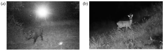 Wild boar (a) and Roe deer (b) captured by camera traps while playback devices were operating.