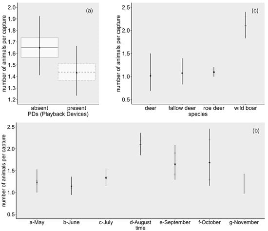 Number of animals sighted per capture (dependent variable) distributed over the GedLMM main effect of playback devices (PDs) (a), seasonal pattern (b), and attending species (c) s.