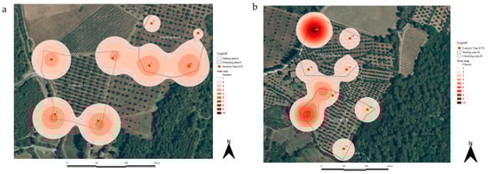 Mapping the total density of species events in a raster environment to the olive grove using the Heatmap plugin of QGIS software (version 3.34.13 Prizren) identified the hotspots frequented by wildlife. Since the locations of the CTs in the experimental areas had been georeferenced, the Heatmap plugin provided a graphical representation of animal visitation in the experimental areas (Figure 5).