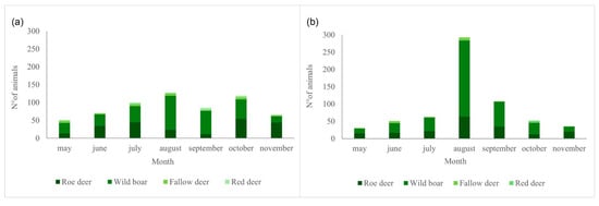 The graphs in Figure 6a, which display species frequencies in testing areas A and B, show that wild animals visited the olive grove almost continuously from late spring to late autumn. Roe deer activity peaked in July, October, and November, while wild boar activity was highest in August and September.