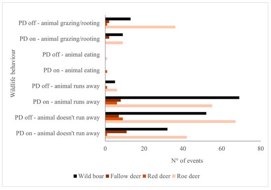 The graph in Figure 7 shows wildlife behavior in both testing areas A and B. The investigated species, especially roe deer and wild boar, tended to run away (55 and 69 events, respectively) when faced with the PD’s acoustic–luminous emission. However, there were situations where the animals continued grazing, rooting, or transiting in front of the devices without running away (106 events total). Browsing events on olive trees were rare in the testing and checking areas. In the checking areas, the prevalent behavior of the wild animals was to graze in front of the CTs, not being disturbed by the sound emissions of the PDs.