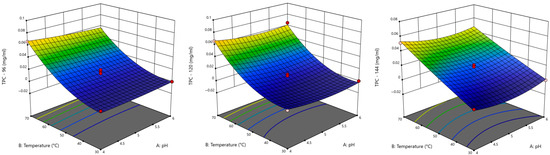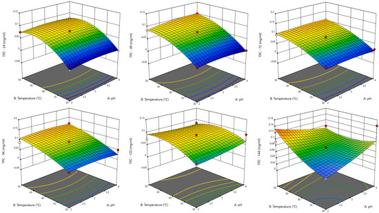 At 48 h and 72 h, TPC shows a slight increase, with the response surface displaying warmer colours and moderate curvature, suggesting a strengthening between enzyme–substrate interactions; a higher enzyme concentration improves degradation. At 96 h, a visible peak appears in the plot, possibly approaching red tones, suggesting that this stage might be the optimal for Lac activity, where the balance of all factors facilitates efficient kraft lignin breakdown. Continued incubation does not yield significant improvement; the response surfaces for 120 and 144 h remain flat, with no notable changes.