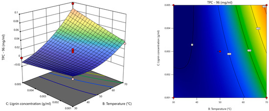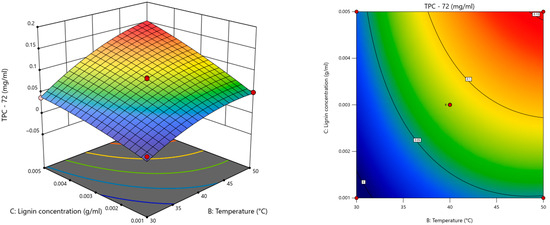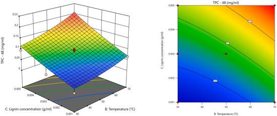 The results (Table S1) indicated that the significant terms for each model were X2 (temperature) and X3 (kraft lignin concentration); the model with superior statistical performance was the one with the response TPC at 48 h (Figure 4), as it had the highest R2 (0.9589) as well as the lowest standard deviation of residuals (0.021) and coefficient of variation (19.68%).