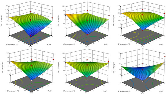 Response surface plots for TPC for Lac as a function of pH and temperature at every 24 h for 144 h period.
