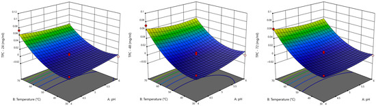 Lac is a multicopper oxidase capable of oxidising phenolic and non-phenolic lignin subunits; its application in lignocellulosic biomass degradation is gaining prominence due to its mild operating conditions and environmentally friendly nature. The 3D response surface plots showing the interaction between pH and temperature (as these factors are pivotal in enzyme activity) provide insight into the optimal conditions for maximising Lac-catalysed kraft lignin degradation. At 24 h, the response surface (Figure 5) shows a modest increase in TPC, with relatively flat trends and no intense curvature or red zones, indicating limited degradation. The model showed mild responsiveness to individual factors, indicating early-stage enzyme activity. As such, Lac activity has initiated degradation, but optimal conditions are not yet achieved.