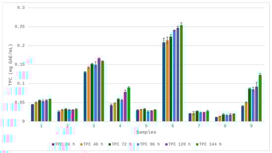 The content of total phenolics was determined using a modified Folin–Ciocâlteu method, where diluted samples were mixed with 0.5 mL Folin–Ciocâlteu reagent and allowed to react in the dark for 8 min. After the addition of 7.5% sodium carbonate solution and distilled water, the samples were incubated for an additional 2 h in the dark. The absorbance was measured at 765 nm with a UV–Vis spectrophotometer (SP-UV 1000 DLAB, Beijing, China), and gallic acid (0.005–0.5 mg/mL) was used for obtaining a standard curve. For all TPC measurements, the values at t = 0 h obtained with the Folin–Ciocâlteu assay were subtracted from all subsequent time points to serve as a baseline. The results were expressed as milligrams gallic acid equivalent (mg GAE) per mL sample [17].