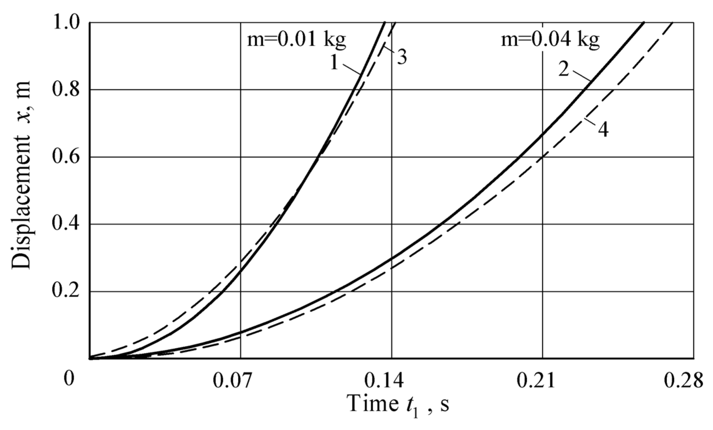 - It was established that the synchronization of the fertilizer particle ejection time from the applicator tube and the angle of its rotation towards the plant is a key factor in ensuring the accuracy of fertilizer application during the continuous movement of the farming robot. To improve the accuracy of this process, graphical dependencies of the fertilizer dose movement over time were constructed and analyzed for different masses ( = 0.01–0.04 kg) and airflow pressure forces ( = 1–3 N).