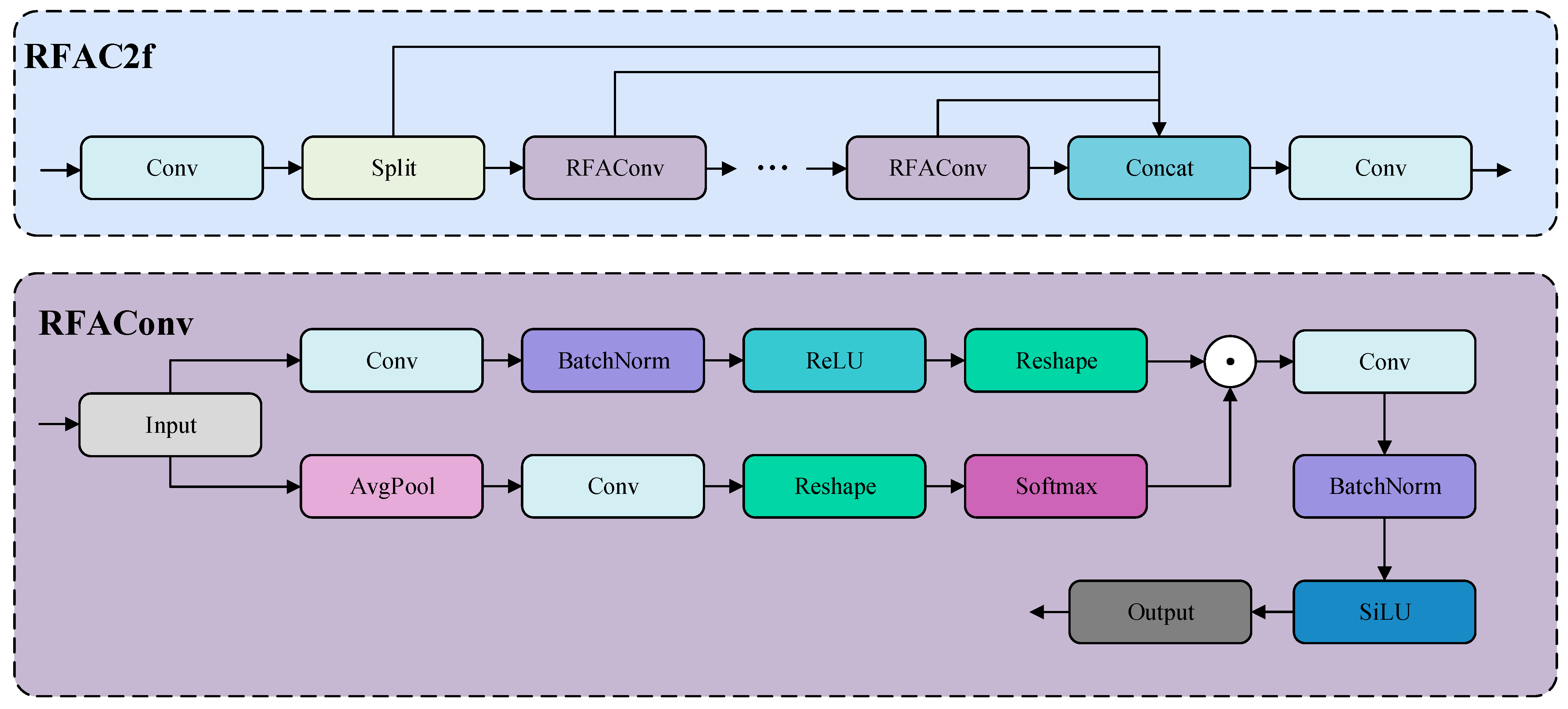 - Multi-scale Receptive Field Attention Bottleneck Module (RFAC2f): To address feature loss in slender cracks and multi-scale crack issues, it innovatively integrates the receptive field-level attention mechanism of RFA convolutions with the multi-branch structure of C2f. This provides the model with enhanced spatial feature perception and cross-scale feature fusion capabilities, making it suitable for detecting slender, low-contrast, multi-scale targets like sugarcane cracks.