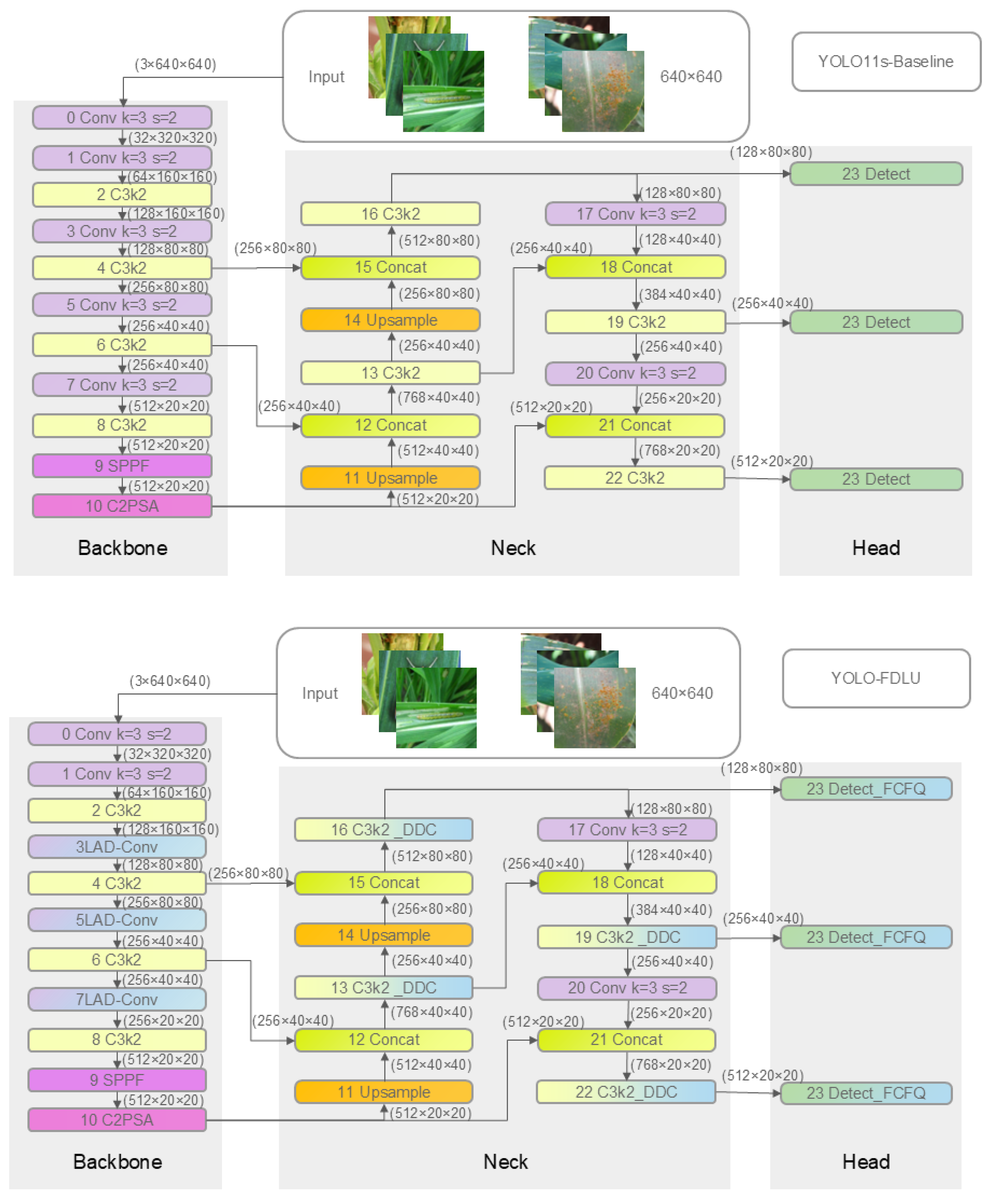 The overall architecture of YOLO-FDLU is illustrated in Figure 3, with the YOLO11s baseline shown above for comparison. YOLO-FDLU retains the lightweight backbone–neck–detection head framework of YOLO11s while introducing four key optimizations to target maize pest and disease detection requirements: