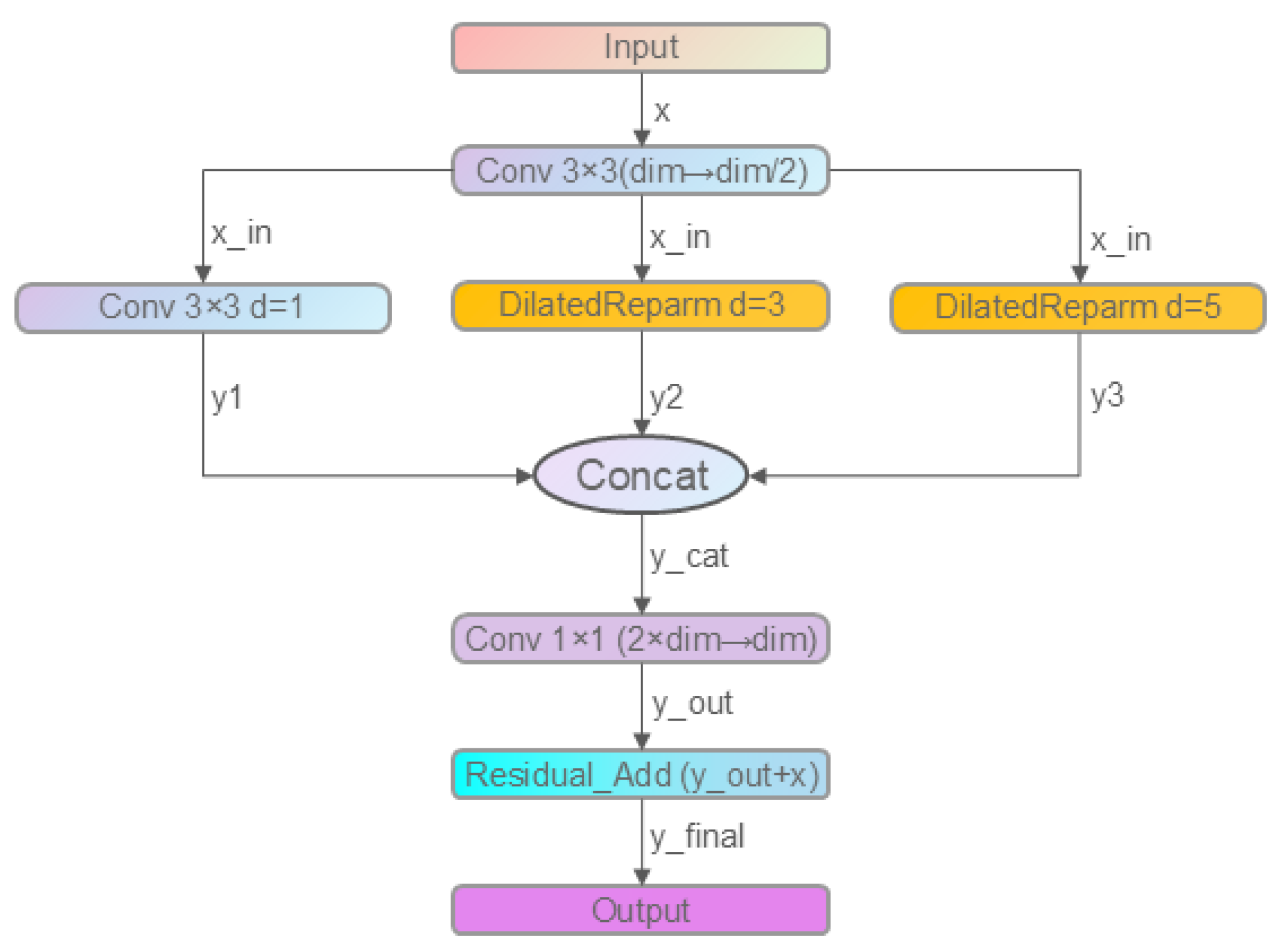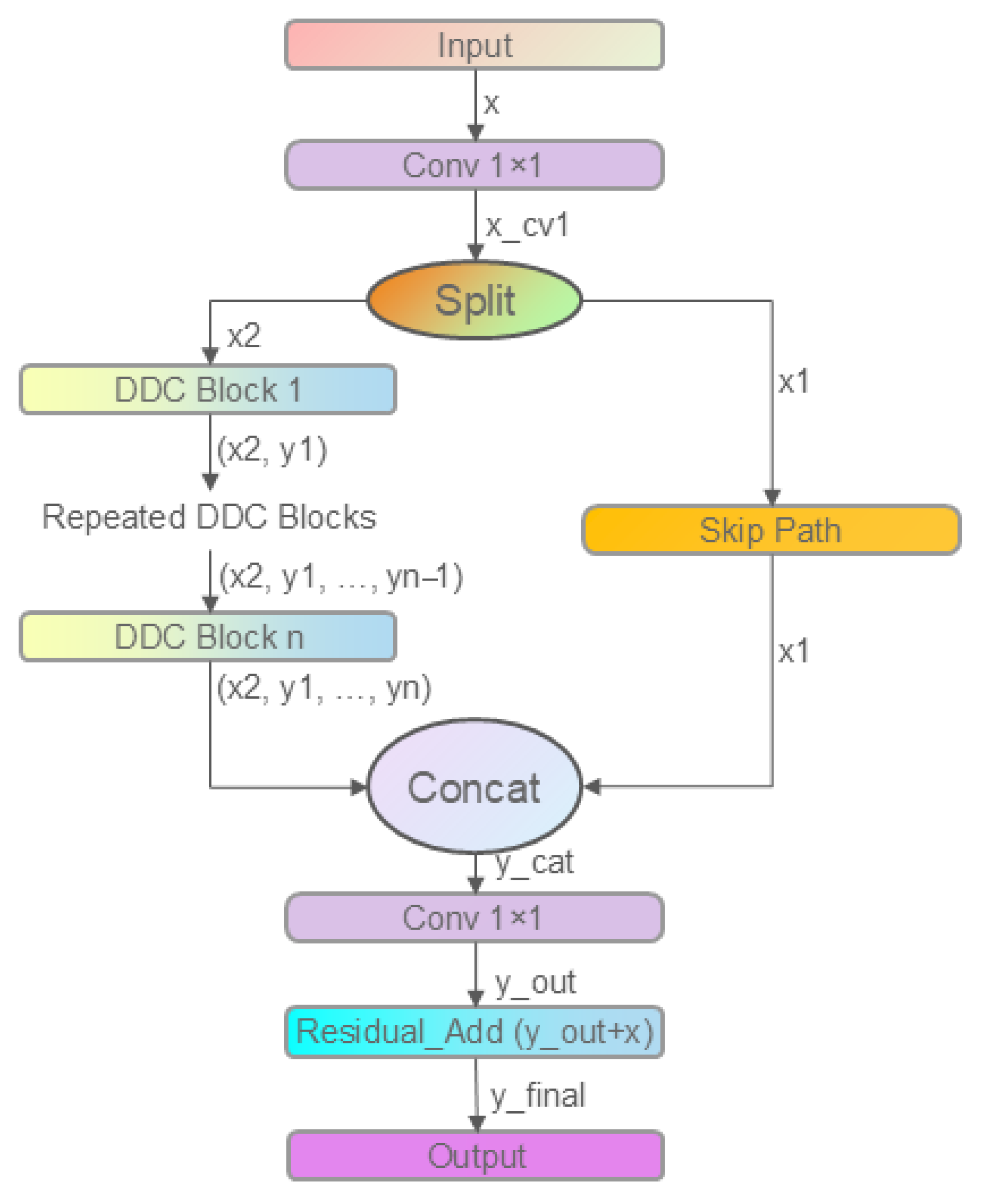 The x 2 branch passes through a series of DDC (DilatedReparam–DilatedReparam–Conv) modules. The outputs y 1 , y 2 , , y n are summed, concatenated with x 1 , and passed through a final 1 × 1 convolution. The result is added to the original input as a residual connection.