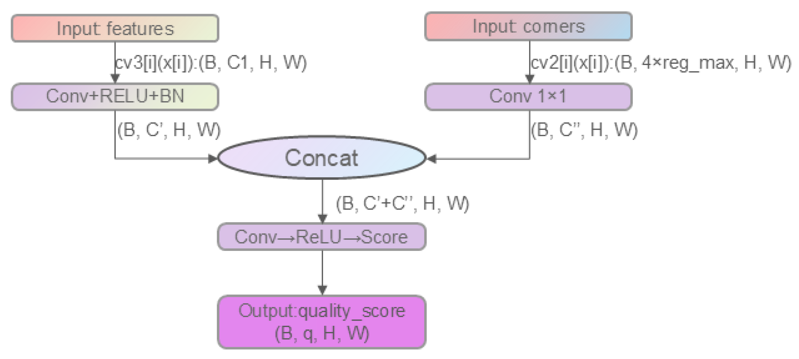 The structure of Detect_FCFQ is shown in Figure 7, which processes multi-scale input features (from P3, P4, P5 stages) via dual convolutional branches (cv2: 2 × 2 convolution, cv3: 3 × 3 convolution) to capture both fine-grained and contextual features [26]. The core innovation lies in the integration of the FCFQ (Feature-Corner Fusion Quality) sub-module, which works with the standard classification and regression branches as follows: