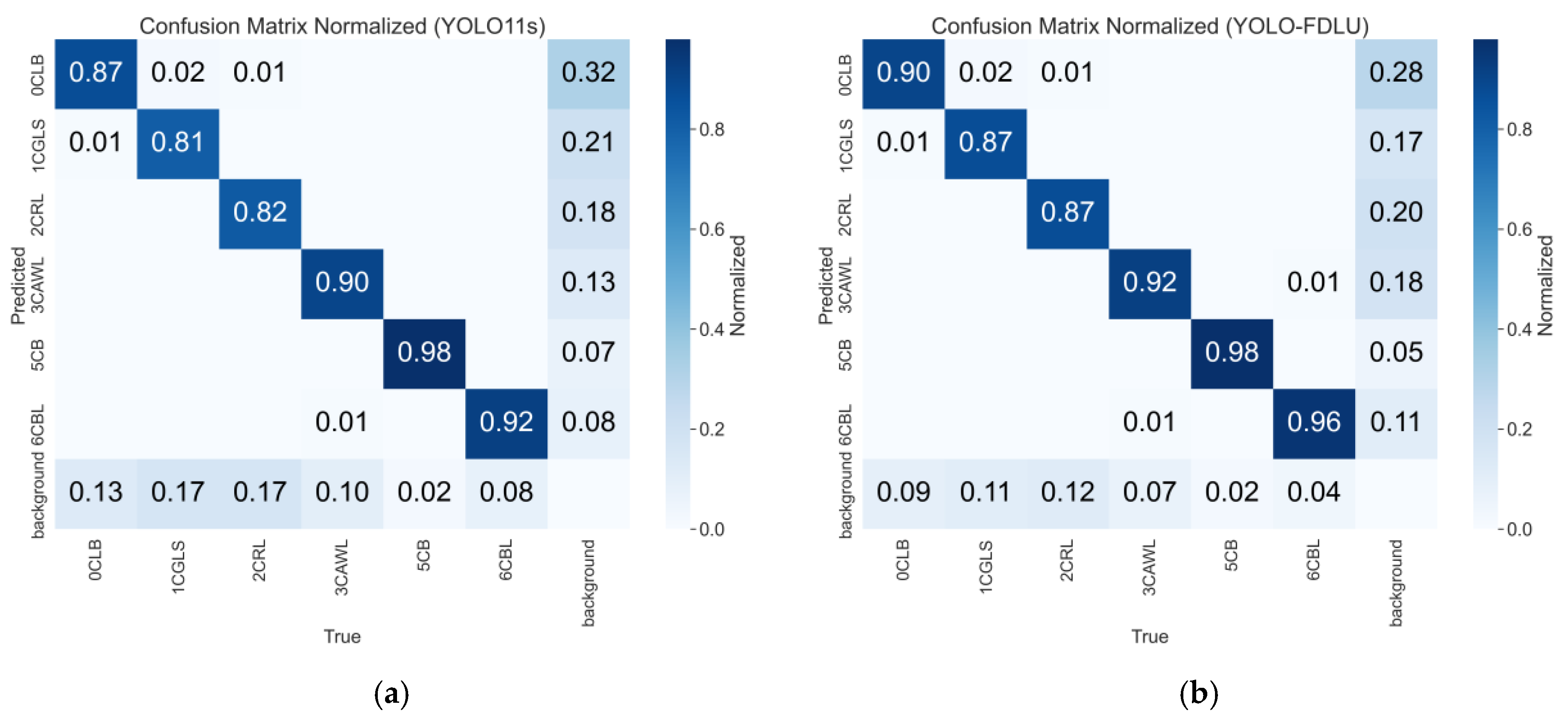 Figure 3. Comparison of YOLO11s baseline (top) and YOLO-FDLU model (bottom).