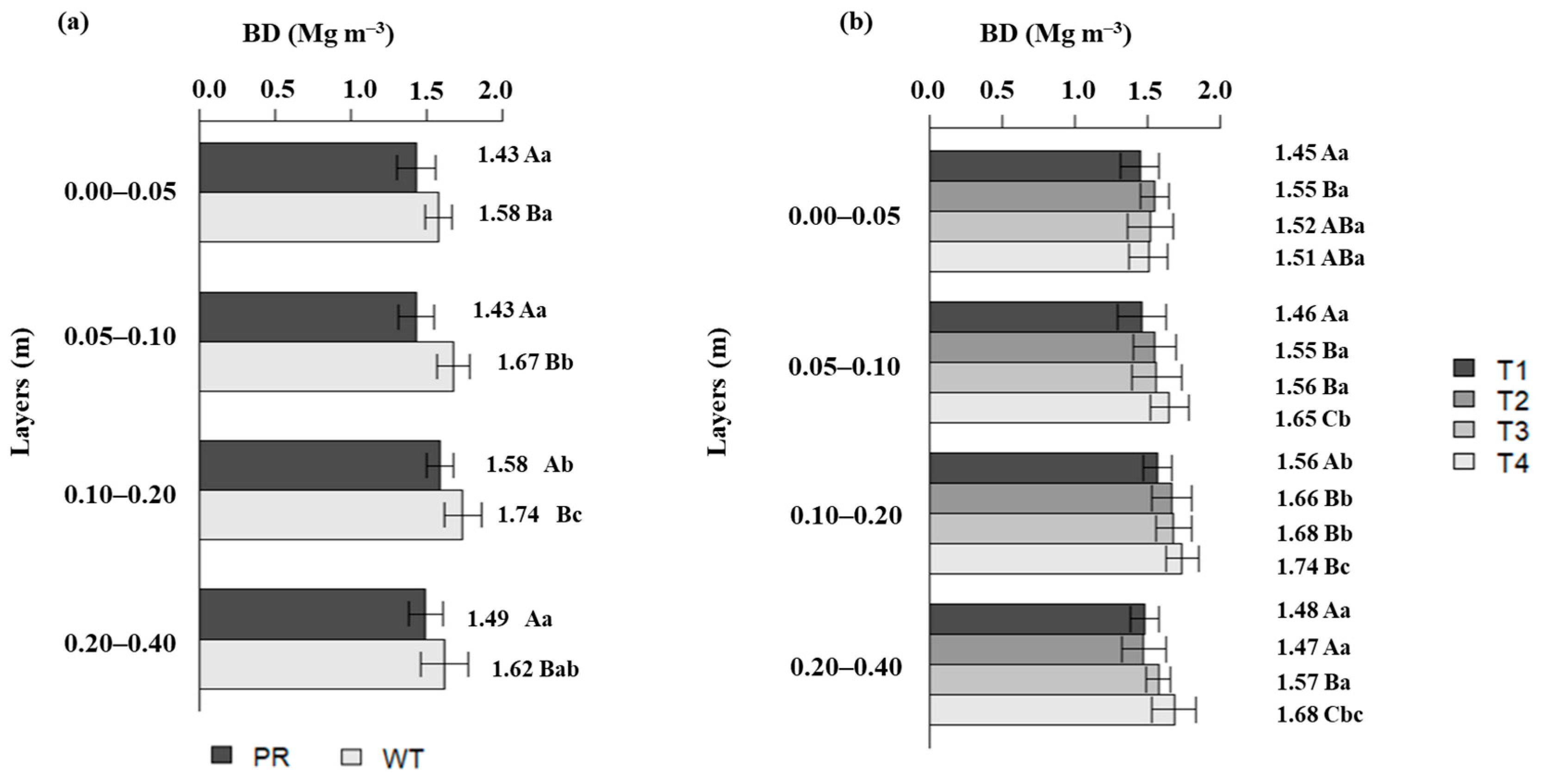 - Souza, G.S.; Souza, Z.M.; Silva, R.B.; Barbosa, R.S.; Araújo, F.S. Effects of traffic control on the soil physical quality and the cultivation of sugarcane. Rev. Bras. Ci Solo 2014, 38, 135–146. [Google Scholar] [CrossRef]