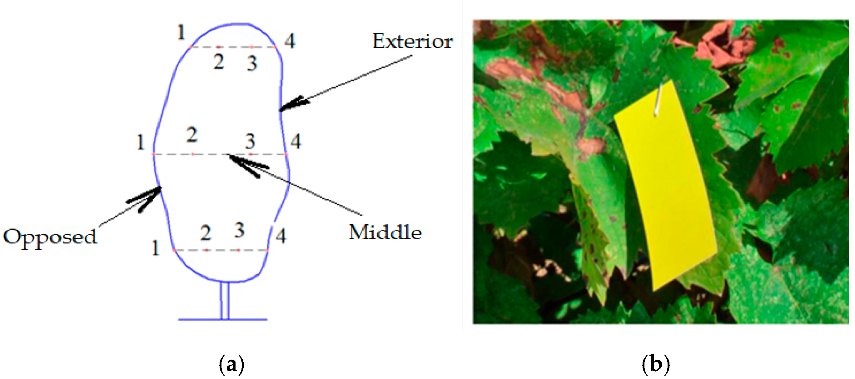 - Pergher, G.; Petris, R. The Effect of Air Flow Rate on Spray Deposition in a Guyot-trained Vineyard. Agric. Eng. Int. CIGR Ejournal 2008, X, 1–15. [Google Scholar]