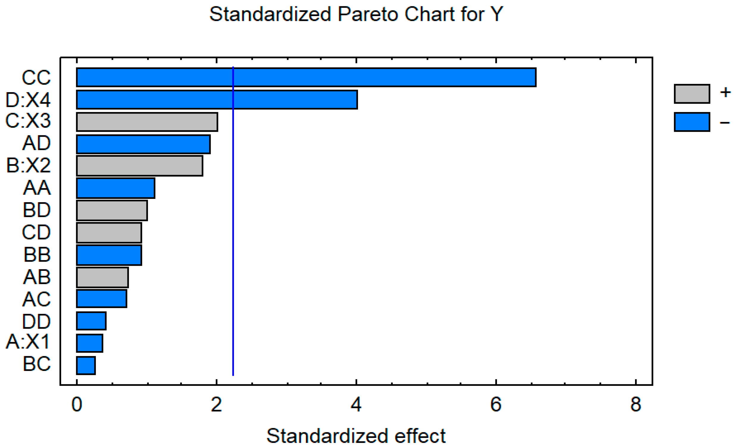 - Factor X3 also significantly influences Y, but with a less steep slope than X4. The dependence Y = f(X3) is presented by a line with a pronounced curvilinear character, which coincides with the Pareto chart data (Figure 5).