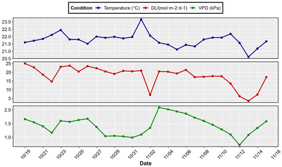 Greenhouse air temperature, relative humidity, and daily light integral (DLI) were monitored using a combo digital sensor (HMP60; Vaisala, Helsinki, Finland) and a quantum sensor (SQ-610; Logan, UT, USA) connected to a datalogger (CR1000X; Campbell Scientific, Logan, UT, USA) for automatic data collection. Throughout the experiment, the growth environment was maintained at an average temperature of 21.80 ± 0.47 °C (average ± standard error), with a vapor pressure deficit (VPD) of 1.41 ± 0.35 kPa and a daily light integral (DLI) of 17.70 ± 5.67 mol m−2 d−1 (Figure 1).