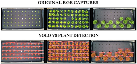 Instance segmentation implemented using a custom YOLOv8 Segment model. The top image displays the original red, green, and blue (RGB) captures for three different stages of the lettuce (Lactuca sativa) crop, and the bottom image shows the results after using the model to predict the location of individual plant objects within the original RGB captures.