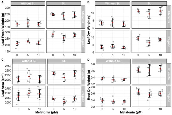 Effects of three melatonin concentrations (0, 5, and 10 µM) on two lettuce (Lactuca sativa) cultivars (‘Chicarita’ and ‘Dragoon’) grown with (supplemental lighting SL) or without supplemental lighting (Without SL) on leaf fresh weight (A), leaf dry weight (B), leaf area (C) and root dry weight (D). Red dots represent the mean (n = 7 plants) ± 95% confidence intervals.