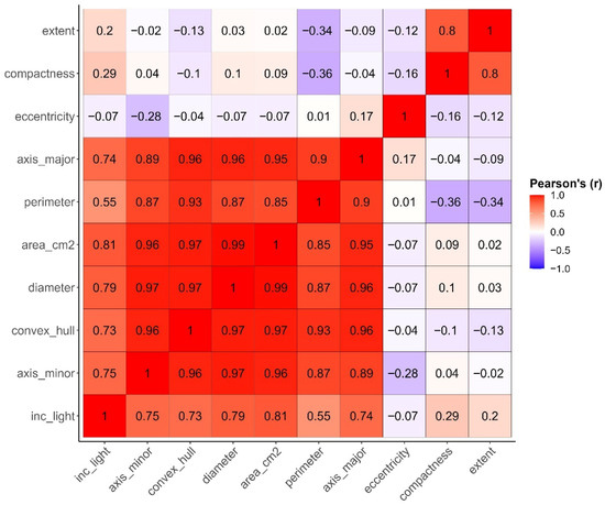 An optimal combination of image features, integrating plant structural information and environmental sensors, can significantly enhance biomass estimation by capturing the environmental factors that affect plant growth throughout its cycle. Golzarian et al. [38] demonstrated that a simple linear regression model using plant area and dry weight, derived from top and side view images, outperformed other non-linear models. However, adding plant age as a predictor alongside plant area further improved prediction accuracy. In our experiment, we found that combining canopy size and available light into a single variable outperformed a simple linear regression model based solely on plant canopy area for predicting fresh and dry weight. Furthermore, machine learning models, such as random forest, were implemented to assess the potential of integrating multiple features to better represent biological responses. The random forest outperformed a LASSO regression model, likely due to its resistance to multicollinearity, as evident in the results, where many variables exhibited high collinearity [39].