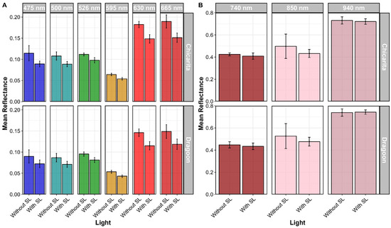 Mean reflectance comparison between cultivars grown under different light conditions for all available 400–950 nm bands. (A) Available bands within the visible light spectrum (475, 500, 526, 595, 630, and 665 nm). (B) Available bands within far-red (740 nm) and near-infrared spectrum (850, 940 nm). Error bars represent upper and lower confidence intervals at 95%.