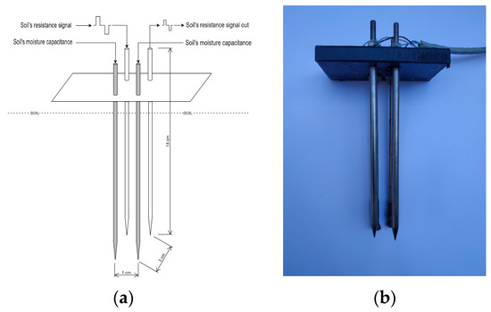 The length of the electrodes in this sensor is 14 cm, while only 12 cm are placed in the soil. It should be noted that the current implementation of the sensor, while effective in controlled conditions, presents certain practical limitations. The choice of long electrodes (12–14 cm insertion) was not arbitrary; it resulted from several iterations and practical experiments. During preliminary testing, we evaluated a range of electrode lengths to identify the optimal trade-off between measurement stability and sensitivity. We observed that shorter electrodes (<10 cm) produced higher signal variability and less representative measurements of the bulk soil properties, while excessively long electrodes (>14 cm) significantly increased sensor resistance and noise, particularly in soils with lower conductivity. Thus, the selected length was chosen to provide more stable and representative measurements over a larger soil volume while avoiding excessive resistance.