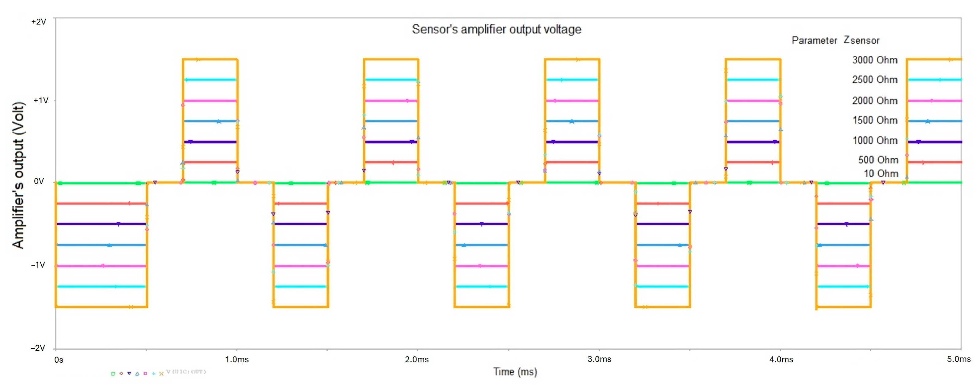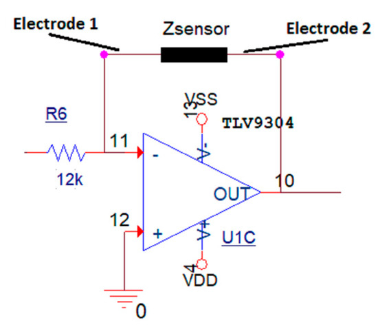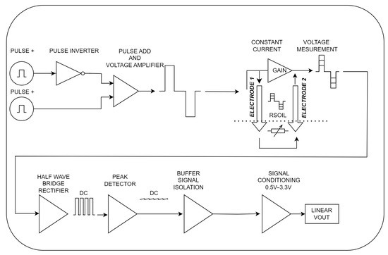 Figure 6, both the positive and negative parts of the bipolar pulse were at a constant potential of ±6 V. The symmetric potential applied to resistor R6 causes a symmetric current through R6 at a constant value of ±0.5 mA. This current passes through the electrodes to the soil and produces a voltage difference depending directly on the soil resistance according to Ohm’s law. Consequently, the input pulse voltage was amplified by the factor of (−Zsensor/R6) (Equation (2)). Impedance, known as Z, can exhibit both real ohmic and capacitive behavior, reflecting the complex nature of a circuit element.
