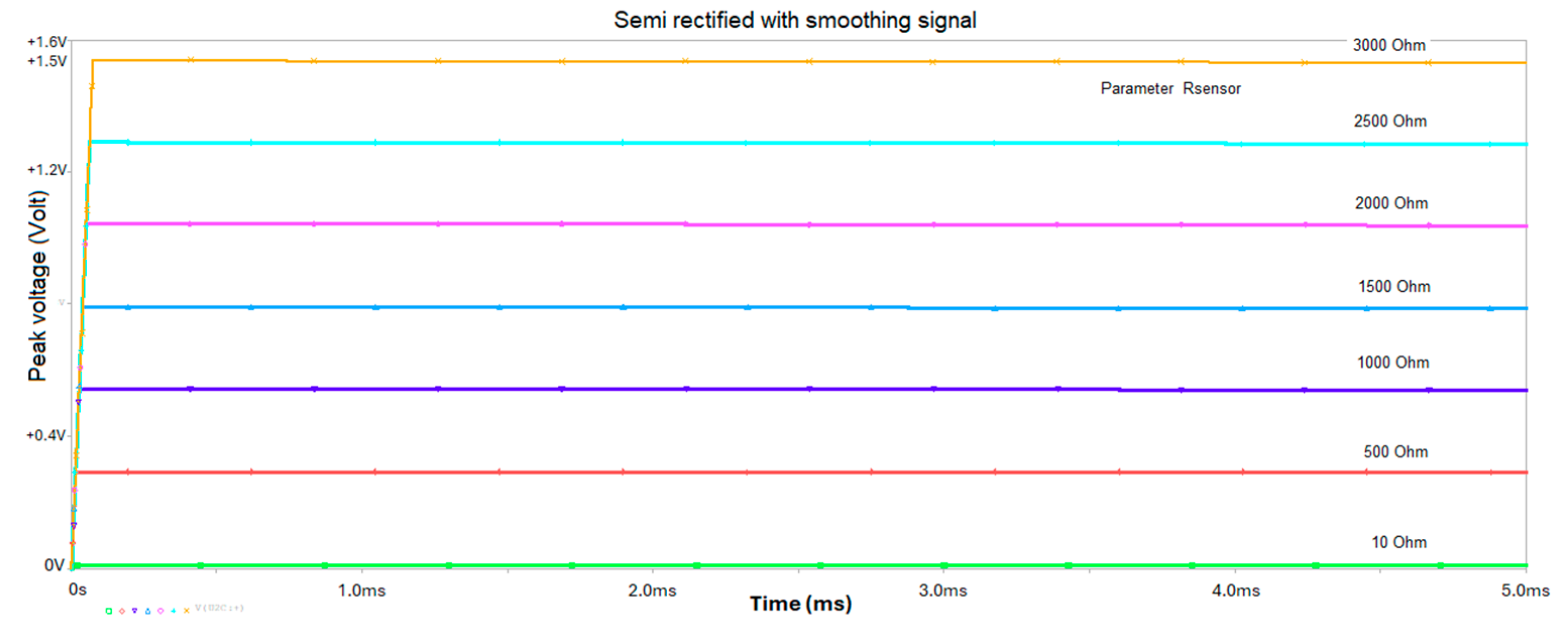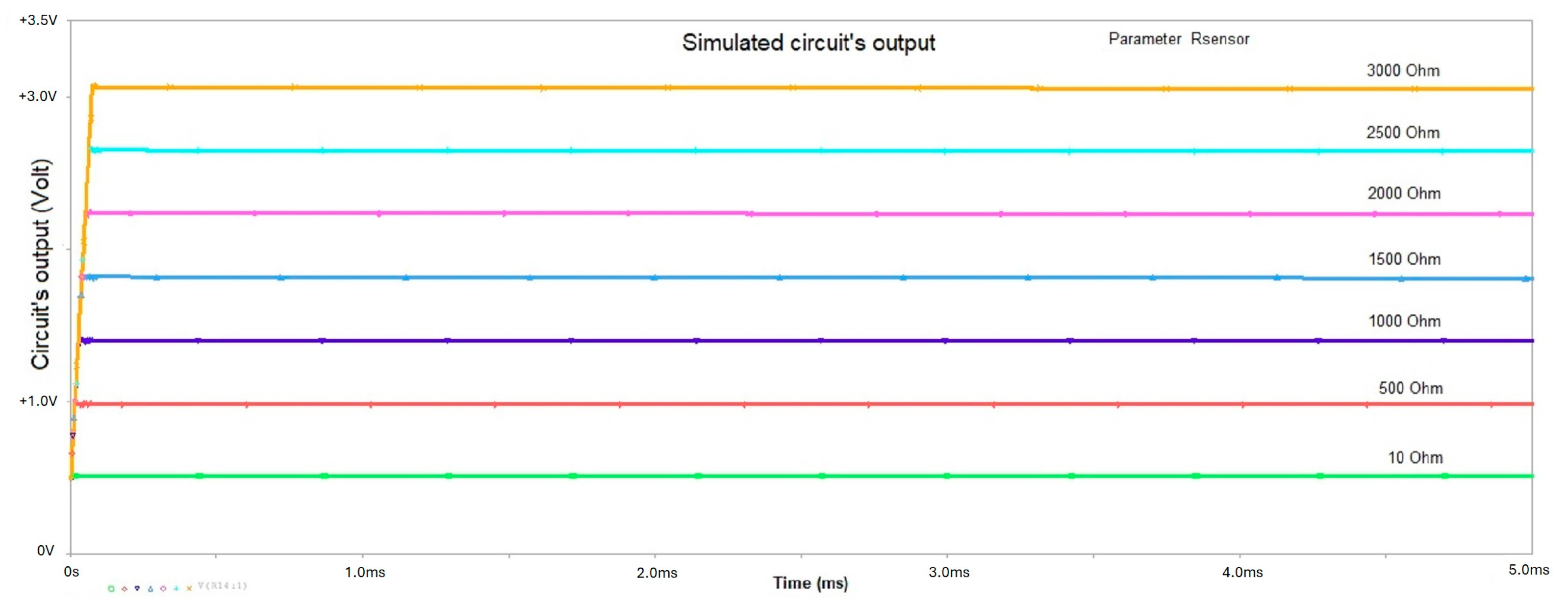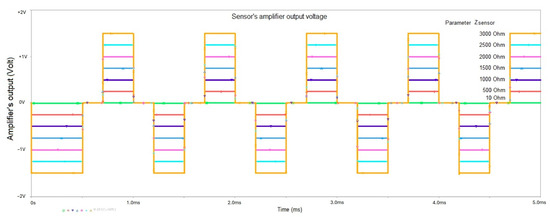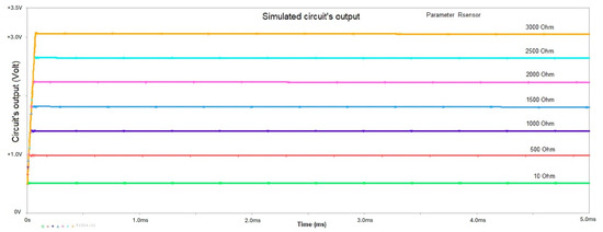 Figure 8 shows the simulated voltage output of the soil sensor amplifier circuit over time using different soil resistance values (10–3000 Ω) as the variable parameters. Additionally, a linear behavior was observed as the soil resistance value increased, which is significant for reliable measurements of the circuit.