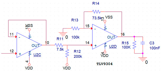 The soil resistance input area was 10–3000 Ω. For these values as input, the soil conductivity amplifier, using Equation (2), outputs 0.005 V to 1.5 V, respectively. Finally, the desired limits at the circuit output U2D were 0.5 V to 3 V, respectively. For these values and VDD = 7.8 V, the calculated resistor values are R11 = 7.538 kΩ, R12 = 200 kΩ, R13 = 100 kΩ, and R14 = 73.527 kΩ, as shown in